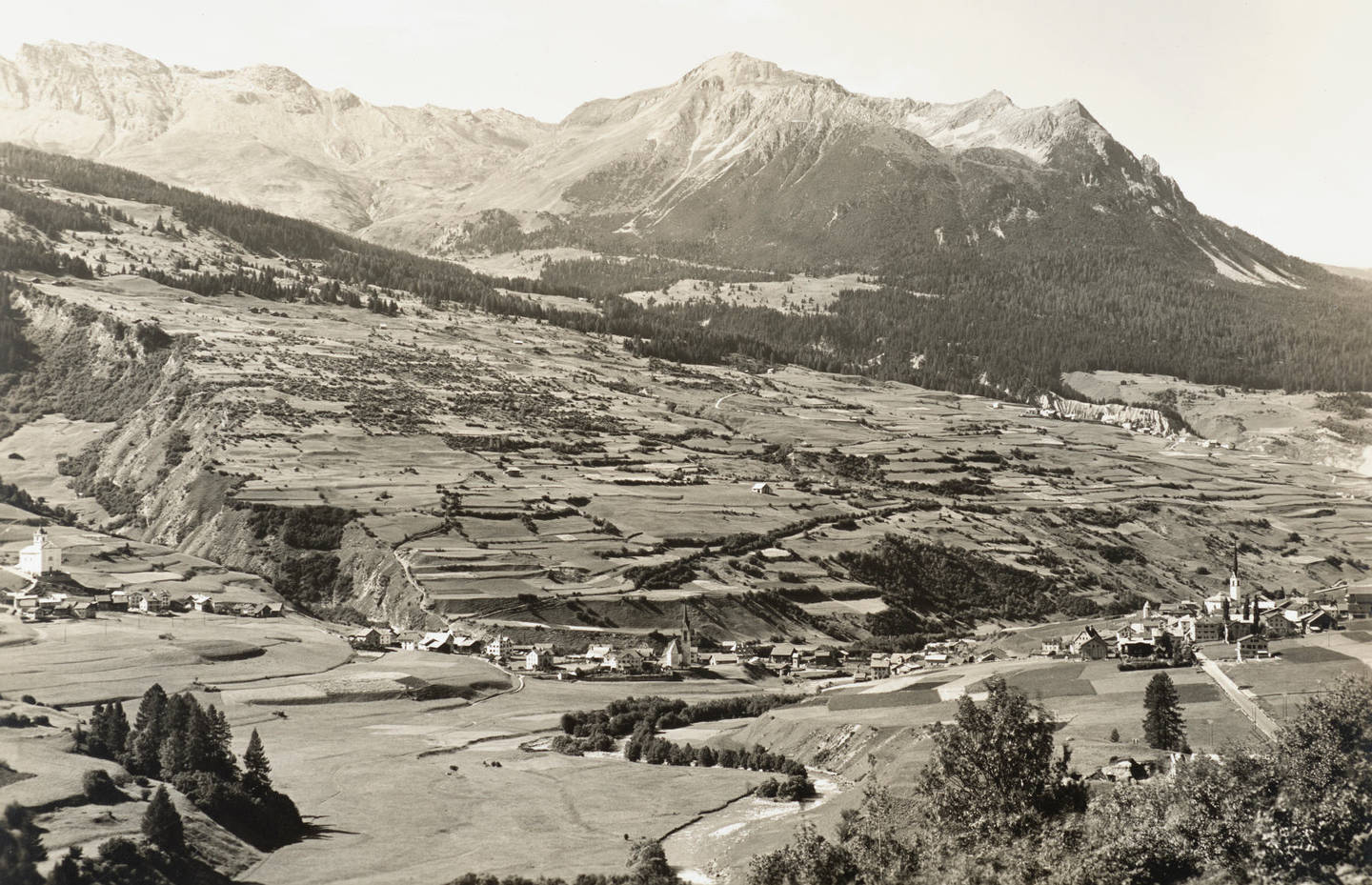 Die Landschaft um Savognin war vor 1950 ein feinstrukturiertes Mosaik aus Stufenreinen, Büschen, Bäumen, Hecken, Wiesen, Weiden und Feldern. Heute ist die Struktur gröber geworden. (Bildquelle: Museum Regiunal Surselva)
